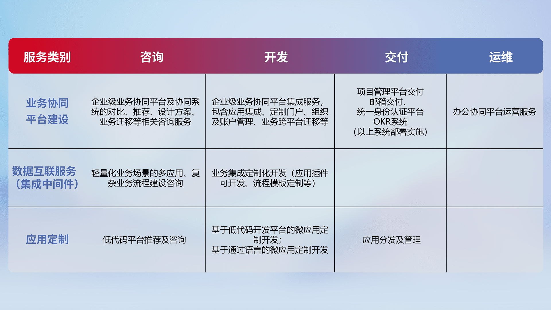 针对钉钉、、、企微、、、IDaas等平台级产品提供产品的规划、、、、方案、、交付、、定制化开发等服务,,,,实现如统一协同办公、、、、智能客户服务、、、混合会议管理、、、智能数据查询、、等业务场景,,实现数字化转型。。